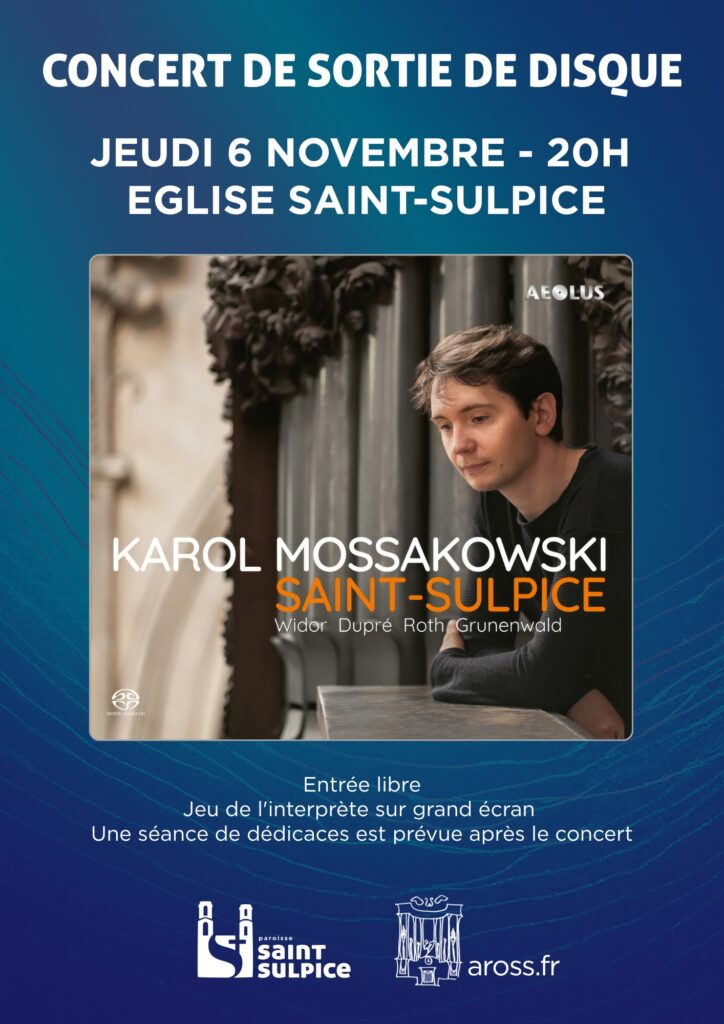 Concert de sortie de disque Karol Mossakowski enregistré au grand orgue de Saint-Sulpice pour Aeolus – Soirée du 06/11/2025 à 20h – Eglise St-Sulpice